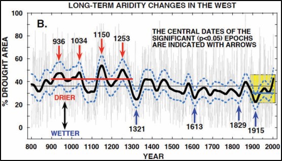 Determine 18 — Lengthy-term modifications in aridity in western North America — Modified from Prepare dinner 2007