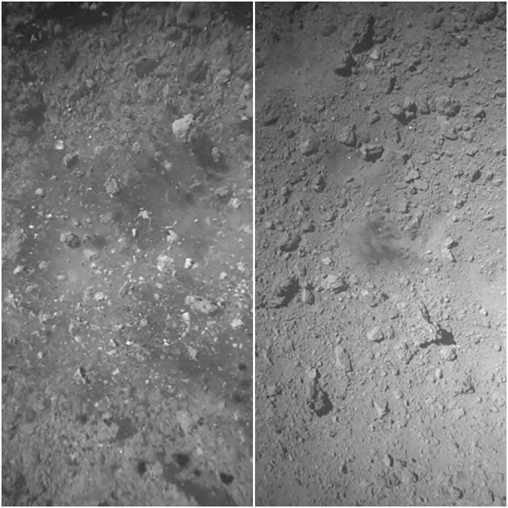 “First picture was taken at 10:06:32 JST (on-board time) and you’ll see the gravel flying upwards. Second shot was at 10:08:53 the place the darker area close to the centre is because of landing,” JAXA tweeted.