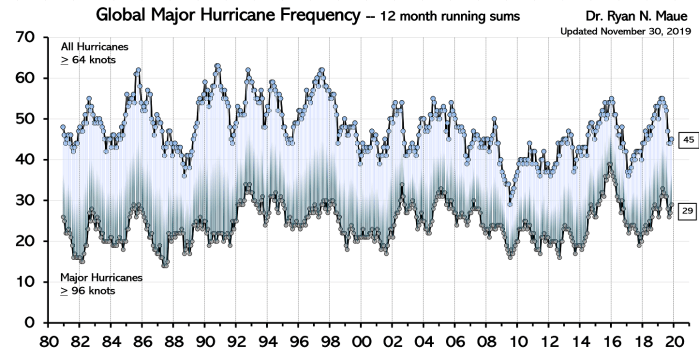 “International Hurricane Frequency (all & main) — 12-month working sums. The highest time collection is the variety of international tropical cyclones that reached at the very least hurricane-force (most lifetime wind pace exceeds 64-knots). The underside time collection is the variety of international tropical cyclones that reached main hurricane power (96-knots+). Tailored from Maue (2011) GRL.” Dr. Ryan N. Maue