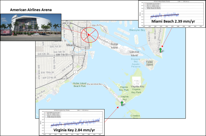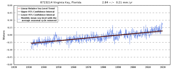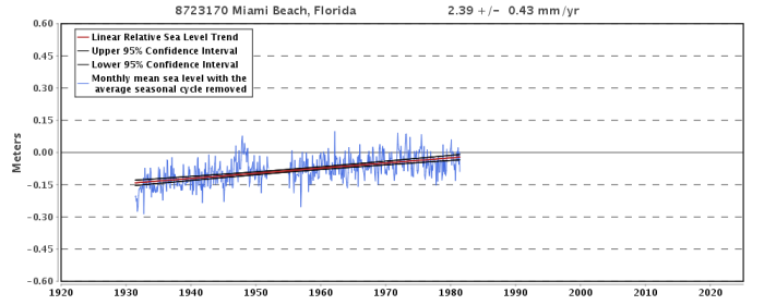 Sea stage rise within the Miami space is just not accelerating and it’s rising at a charge of about 1 foot per century. Even at three.5 mm/yr, sea stage would solely rise by 14 cm (5.5 in) over the following 40 years.