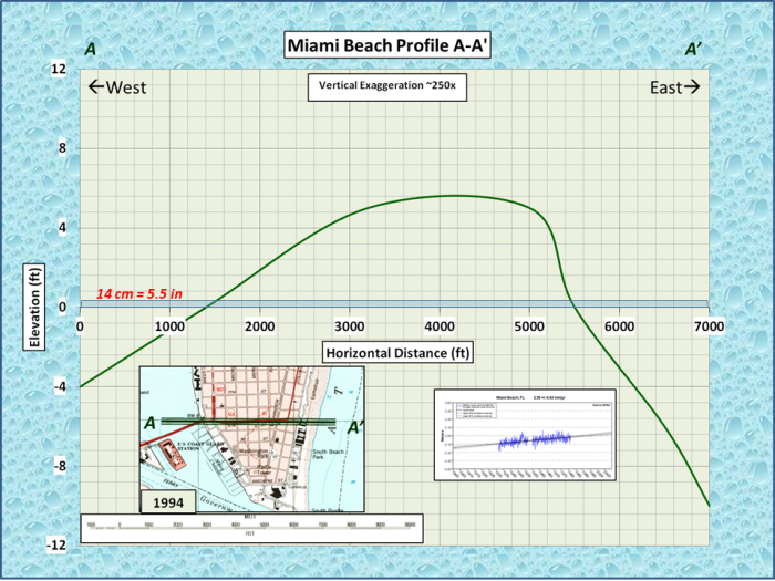 Topographic profile A-A’. The NOAA sea stage pattern has been plotted at.the identical vertical scale. Alarmists Gone Wild: “Alarmist CO2 Headlines Create Confusion”… Notably When Accompanied by Sea Stage Alarmism.