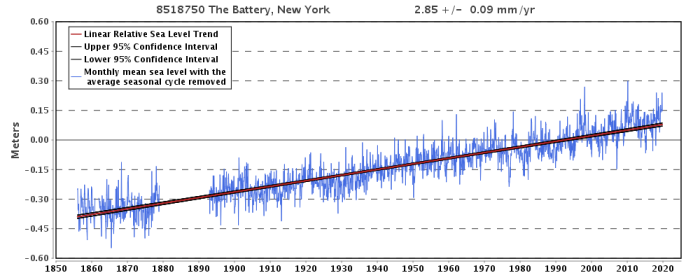 Sea stage rise at The Battery has been a gradual 2.85 mm/yr since earlier than the Confederacy fired on Fort Sumter.