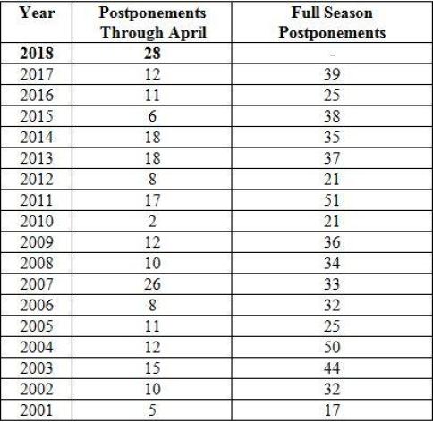 RainoutsAprilFull Season20182820171239201611252015638201418352013183720128212011175120102212009123620081034200726332006832200511252004125020031544200210322001517200018Common1334σ710+2σ2653-2σ014