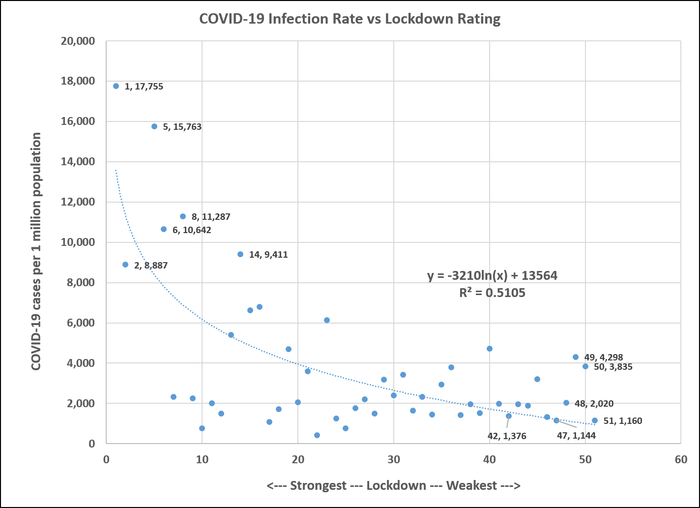 However, however, however… Correlation just isn’t causation! States might have locked down extra tightly in response to the infections! The lockdown score was as of April 6, 2020 and the an infection knowledge are as of Could 11, 2020.