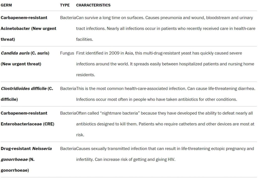 The desk under lists CDC’s 5 “pressing” threats of concern to human well being: