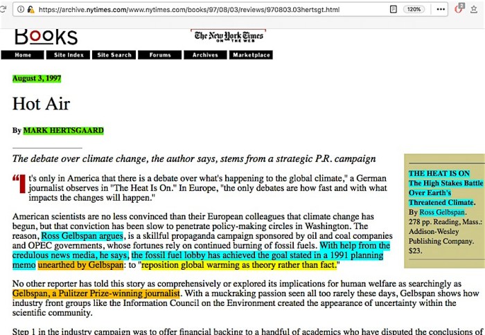 That Mark Hertsgaard, the 1997 New York Instances ebook reviewer of Ross Gelbspan’s “The Warmth is On,” the place he managed to incorporate — inside one sentence of one another — each the false accolade about Gelbspan being a Pulitzer winner, and the false declare that Gelbspan unearthed the “reposition international warming as concept relatively than reality” ‘leaked technique memo’ phrase (which subsequently grew to become so broadly unfold as proof of skeptic local weather scientists partaking in a pay-for-performance disinformation conspiracy association with fossil gas executives that it’s at the moment utilized in international warming lawsuits …. however maintain that thought for a second).