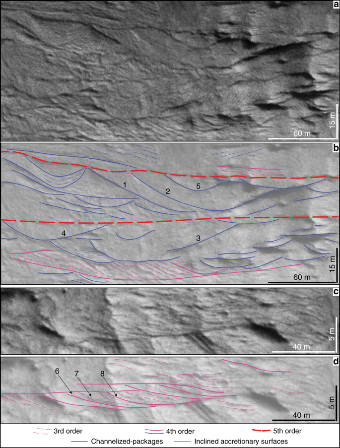 “a Shut up of white field indicated in Fig. 2b. b Architectural interpretation of a displaying a lot of channels (blue traces). Some examples protect former channel margins, sturdy proof for authentic channel lateral migration. Channelised packages have related inclined accretion surfaces (magenta traces), with all packages topped and floored by extra intensive fifth-order surfaces (pink traces). Fifth-order surfaces probably archive avulsion occasions. A earlier channel margin (1 + three) laterally coalesces with the ultimate channel margin (2 + four) indicating that the unique energetic channel migrated laterally. A nested channel-cut (5) is current inside a bigger channelised package deal. c Shut up of white field indicated in Fig. 2b. d Examples of inclined accretion surfaces with distinct foreset and bottomset components (topsets truncated by overlying strata). Downlapping of inside, third-order surfaces counsel a number of accretion phases. Word that line drawings usually are not tried in areas the place publicity is poor. A 3rd-order floor (7) downlaps the bottomset of an underlying fourth-order floor (6) indicating bar migration. A subsequent fourth-order floor (eight) truncates the earlier fourth-order floor (6) indicating a number of phases of bar-building exercise.” Salese et al., 2020