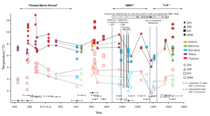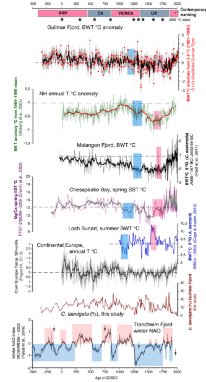 “The document demonstrates a warming throughout the Roman Heat Interval (~350 BCE – 450 CE), variable BWT [bottom water temperatures] throughout the Darkish Ages (~450 – 850 CE), constructive BWT anomalies throughout the Viking Age/Medieval Local weather Anomaly (~850 – 1350 CE) and a long-term cooling with distinct multidecadal variability throughout the Little Ice Age (~1350 – 1850 CE). The fjord BWT document additionally picks up the up to date warming of the 20th century (introduced right here till 1996), which doesn’t stand out within the 2500-year perspective and is of the identical magnitude because the Roman Heat Interval and the Medieval Local weather Anomaly.[vii]”