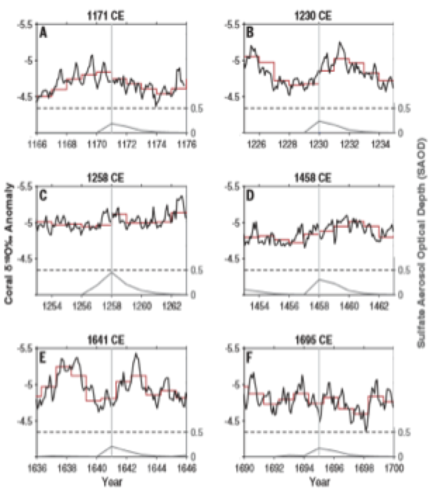 Determine 6: Coral δ18O measurements of temperatures for six main volcanic eruptions within the final 900 years, with strains on the backside displaying the diploma to which stratospheric aerosols diminished downwelling daylight throughout the volcanos