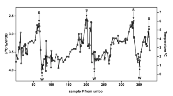 One other examine utilizing mass spectrometry to find out temperatures utilizing oxygen isotope ratios was carried out over in fjords in Sweden, overlaying a 2500 yr interval. One of many fjords is on the north coast of Sweden (Atlantic Ocean) and the opposite on the southwest (North Sea close to Denmark). The authors state:
