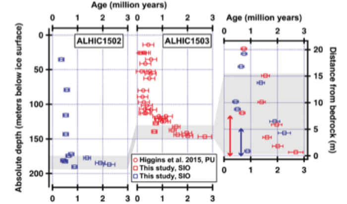 Determine 1: Age of samples taken at indicated depth beneath floor of ice core