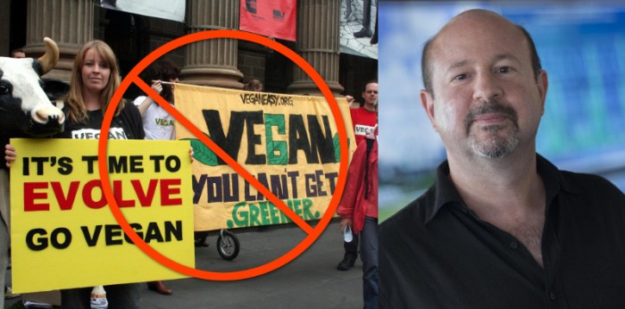 Mann vs the Vegans. Left: Takver from Australia [CC BY-SA 2.0], through Wikimedia Commons. Proper That is Michael Mann, Distinguished College Professor of Atmospheric Sciences and Geosciences, Penn State.