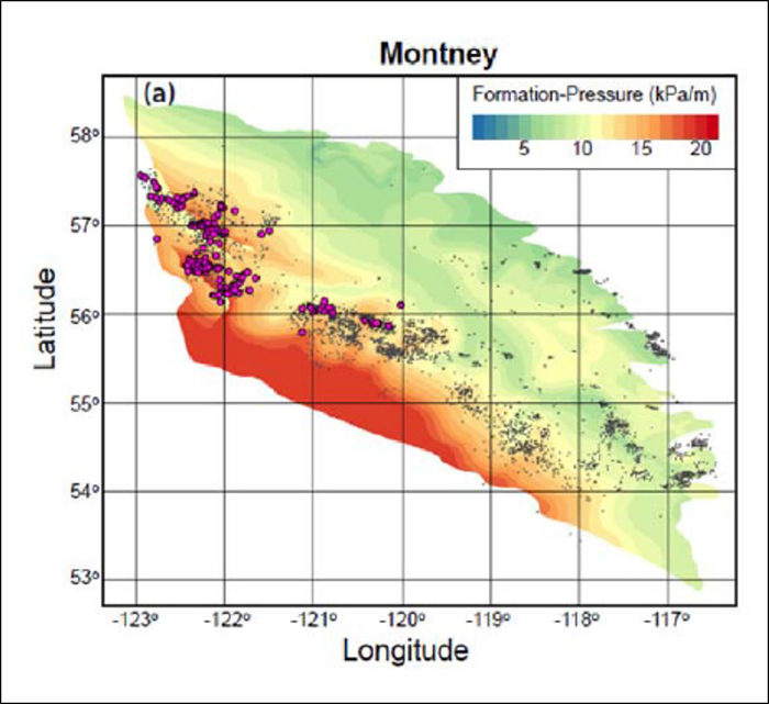 Fluid-injection processes corresponding to disposal of saltwater or hydraulic fracturing can induce earthquakes by rising pore strain and/or shear stress on faults. Pure processes, together with transformation of natural materials (kerogen) into hydrocarbon and cracking to provide gasoline, can equally trigger fluid overpressure. Right here we doc two examples from the Western Canada Sedimentary Basin the place earthquakes induced by hydraulic fracturing are strongly clustered inside areas characterised by pore-pressure gradient in extra of 15 kPa/m. Regardless of intensive hydraulic-fracturing exercise related to useful resource improvement, induced earthquakes are just about absent within the Montney and Duvernay Formations elsewhere.