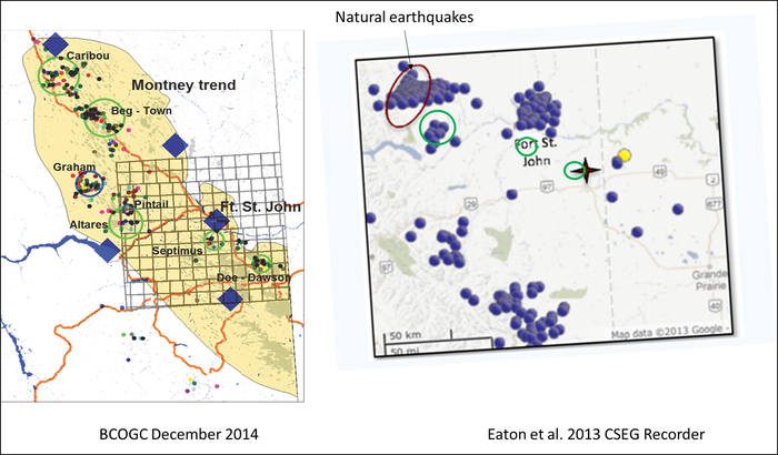 Determine 9. (Left) BCOGC map of frac-induced earthquake clusters (inexperienced circles). (Proper) “earthquake occasions within the Canadian nationwide earthquake catalog from 2000/01/01 to 2013/02/04” (blue circles), pure earthquakes with LPLP signatures (brown oval) and BCOGC inexperienced circles super-imposed. The situation of the Rolla Microseismic Experiment (RME) is denoted by the Four-pointed star southeast of Fort St. John.