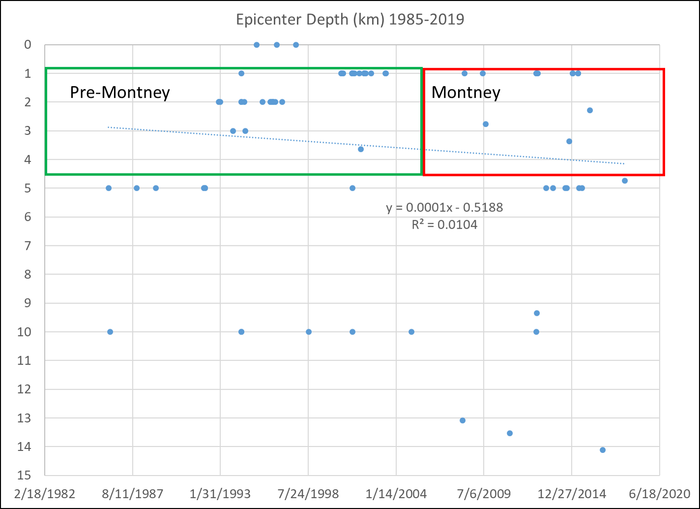 Determine 7. Earthquake epicenter depths (km). The inexperienced and crimson rectangles signify the depth vary of Montney gasoline manufacturing. Information from Earthquakes Canada.