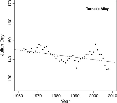 Figure 6. “Plot of peak twister exercise for the guts of Twister Alley. The Julian day that corresponds to peak twister exercise plotted for every 10 12 months shifting window by variable sort for the area, with linear trendlines. The years on the x axis symbolize the final 12 months of the related 10‐12 months shifting common (e.g., 1963 represents 1954–1963).” - Lengthy and Stoy (2014).