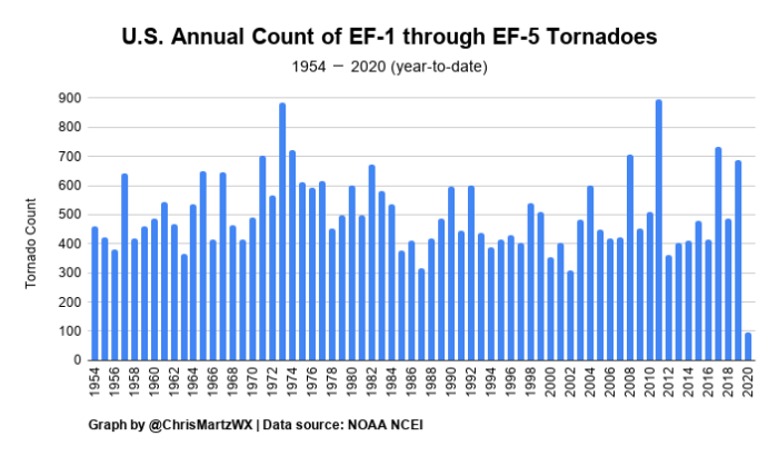 Determine 7. U.S. annual twister rely, excluding EF-Zero’s; 1954 - 2020.