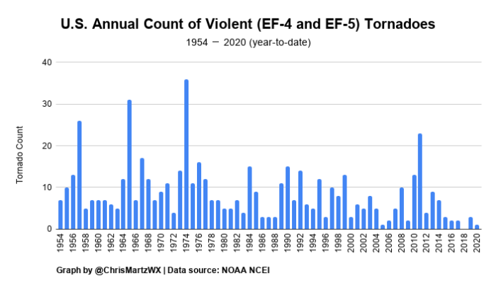 Determine eight. U.S. annual violent twister (EF-Four or EF-5) counts; 1954 - 2020.
