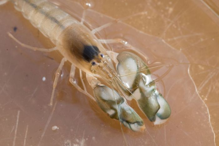 A snapping shrimp in a petri dish. The tiny critters are among the many loudest animals within the ocean. Credit score: Woods Gap Oceanographic Establishment.