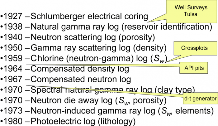 Determine 2. “A timeline of nuclear logging highlights the introduction and evolution of business nuclear-logging measurements.” PetroWiki