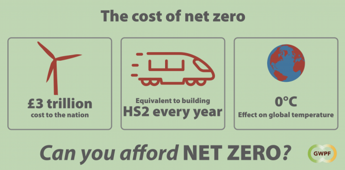 “Though the Committee on Local weather Change claims that web zero might be achieved at modest value, they’ve now quietly admitted that they haven’t really ready any detailed costing. Sadly, Parliament appears to have taken them at their phrase, and we at the moment are launched into a mission that dangers to bankrupt the nation.”