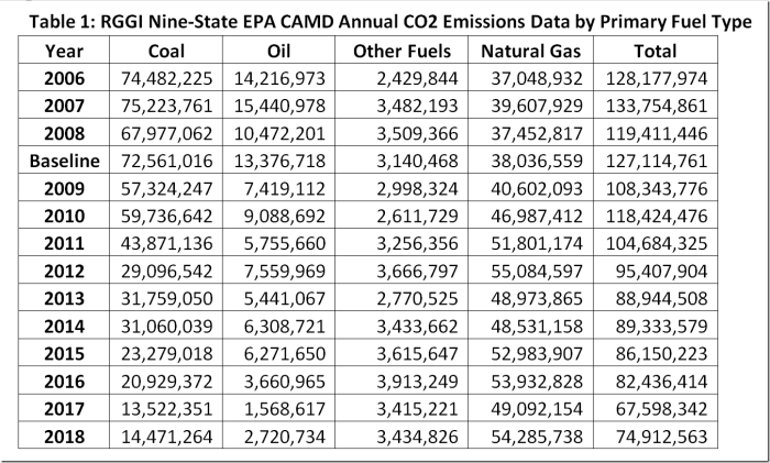 To be able to consider the RGGI emissions discount claims I used information from the Environmental Safety Company Clear Air Markets Division air markets program web site. Emissions information from the electrical producing unit (EGU) sector can be found from earlier than RGGI began to the current, so I downloaded all of the EGU information for the 9 states presently in RGGI from 2006 till 2018. To be able to set up a baseline, I calculated the common of three years earlier than this system began. As proven in Desk 1 the entire emissions have decreased from a baseline of over 127 million tons previous to this system to only below 75 million tons in 2018. This represents a 40% lower.