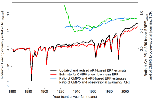 Determine 2 within the Reply, reproduced under, reveals the estimated forcing evolution in CMIP5 historic simulations (crimson line) in comparison with the AR5-based/LC18 median estimate (black line), and the way their ex-volcanic ratio (blue line) compares with the corresponding ratio of ex-volcanic warming relative to TCR (inexperienced line).