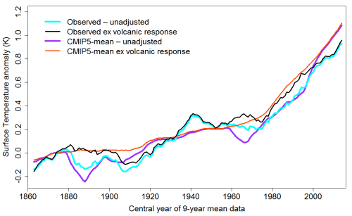 Determine 1 within the Reply, reproduced under, reveals how noticed and CMIP5 simulated historic international temperature evolution compares, earlier than and after removing of volcanic influences.