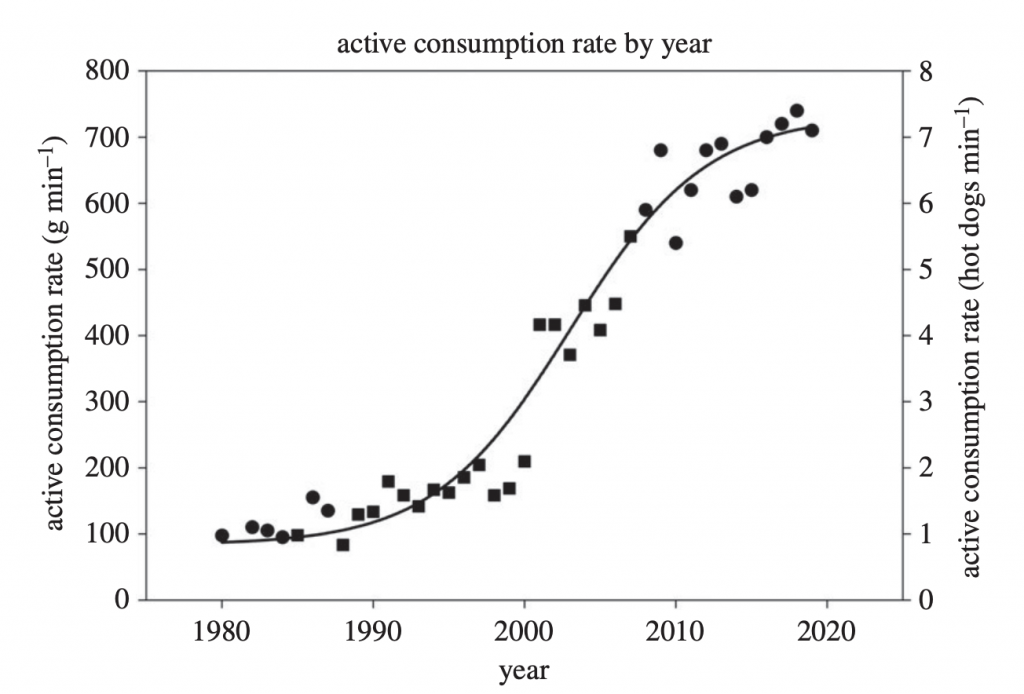 Above: Lively consumption price of the winner of the Nathan’s Well-known Scorching Canine Consuming Contest by 12 months, with circles representing 10-minute competitions and squares representing 12-minute competitions.
