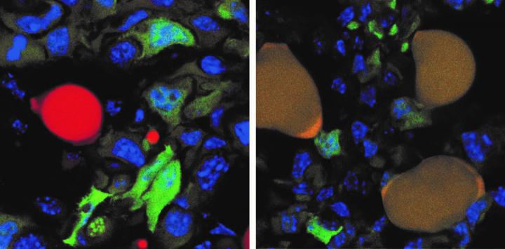 The picture above reveals this course of, with the most cancers cells tagged with a inexperienced fluorescent protein and regular pink fats cell on the left. The cancer-turned-fat cells show as brown (on the fitting) as a result of the pink of the fats cells combines with the inexperienced of the protein most cancers cell tag.