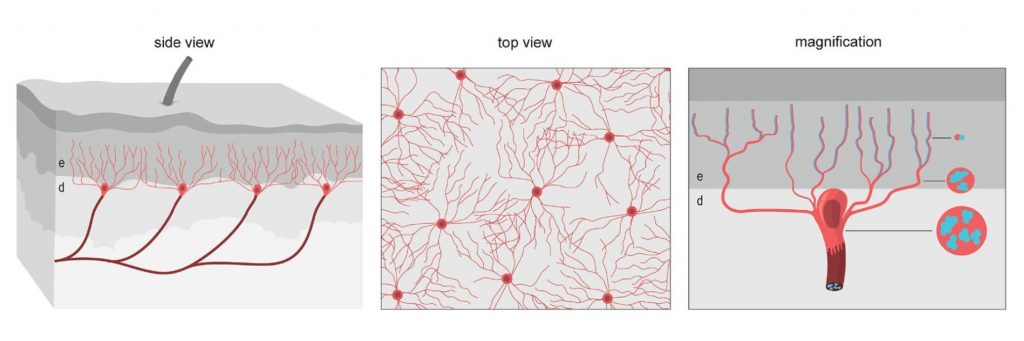 Above: The place of ache receptive Swann cells (crimson) and nerve cells (blue) within the pores and skin’s dermis (d) and dermis (e).