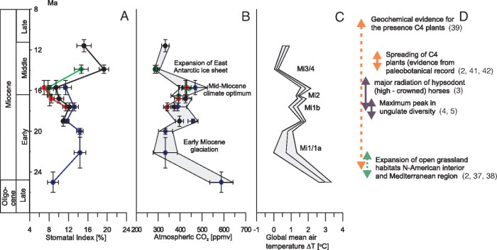 “Late Oligocene–Miocene stomatal index information, inferred atmospheric CO2 fluctuations, and results on international temperature in contrast with main occasions in terrestrial ecosystems.” Kürschner et al., 2008.