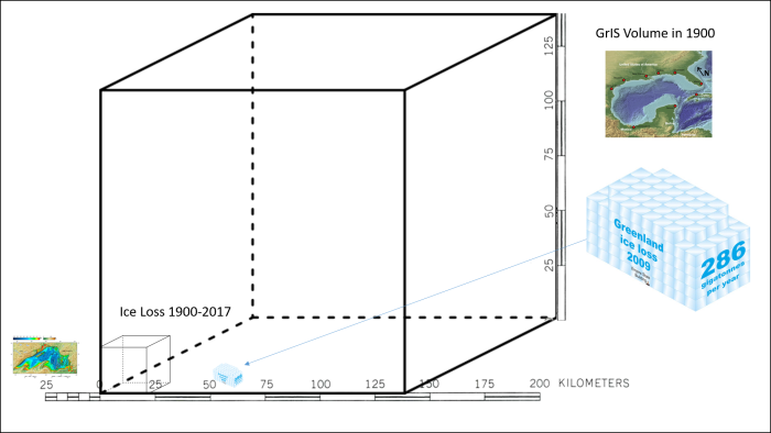 Determine 10. Based mostly on the asserted lack of ice since 1900, the GrIS has misplaced the equal of a Lake Superior-sized ice dice. Nonetheless the GrIs remained bigger than the Gulf of Mexico (by quantity) regardless of shedding a Lake Superior. The Gulf of Mexico has a quantity of about 2.5 million km3. If the GrIS melted, the amount of water can be about 2.71 million km3. Earlier than shedding Lake Superior, the water quantity was 2.72 million km3.