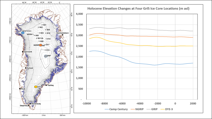 Determine 12. Many of the melting for the reason that starting of the Holocene has occurred on the outboard, decrease elevation parts of the GrIS – Similar because it ever was. X-axis is in calendar years AD(BC). Elevation reconstruction information from Vinther et al., 2009. Map from Weißbach et al., 2015.