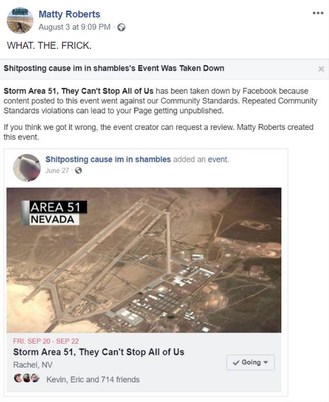 In line with a screenshot from one of many occasion’s founders, Matty Roberts, the notorious and viral Fb occasion totally titled “Storm Space 51, They Can’t Cease All Of Us” went towards the platform’s neighborhood requirements. Thus, the occasion was deleted.