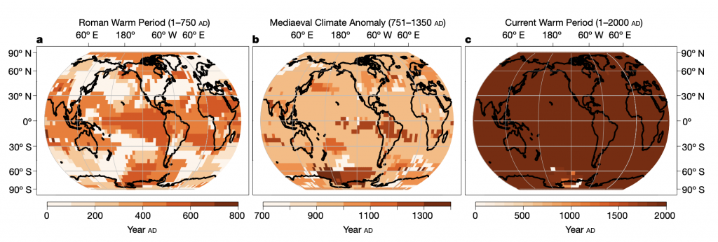 Utilizing a strong database compiled from nearly 700 proxy information of historic temperatures – together with bushes, ice, sediment, corals, cave deposits and documentary proof – the authors of those two papers have woven collectively a nuanced world image of local weather adjustments for the reason that time of the Romans.