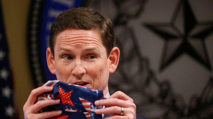 “Dallas County Choose Clay Jenkins shows an improvised material face masks made with a bandana and hair ties as he addresses members of the media relating to the brand new coronavirus pandemic on Wednesday, April eight, 2020 on the Dallas County Emergency Operations Heart in Dallas.(Ryan Michalesko / Workers Photographer)”