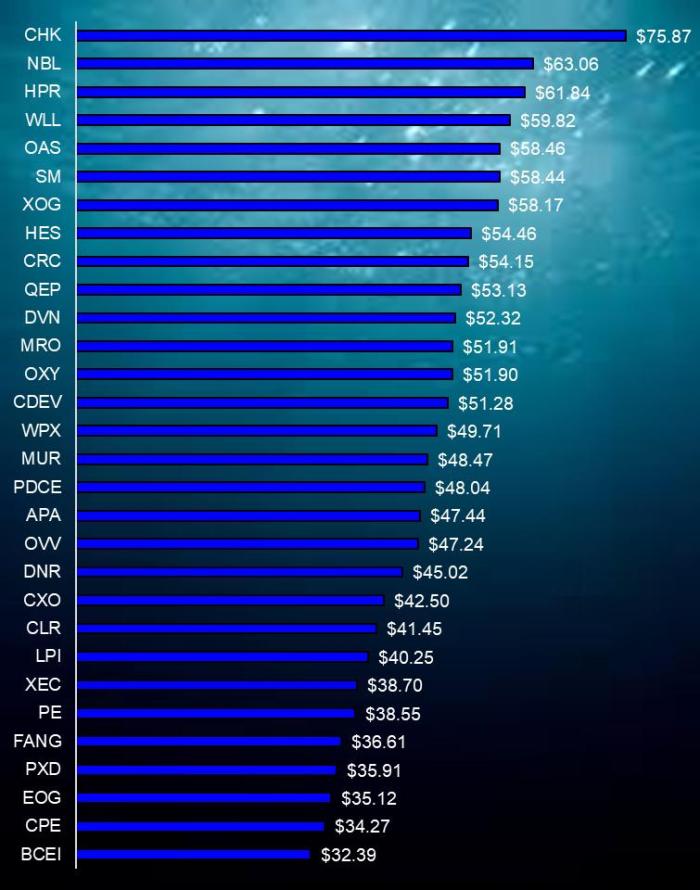 The US, as a nation, has no comparable worth. And the budget-balancing worth varies extensively from firm to firm. That is Tug Eiden’s estimate of the worth required to cowl working prices for a gaggle of unbiased oil firms, largely “shale” gamers.