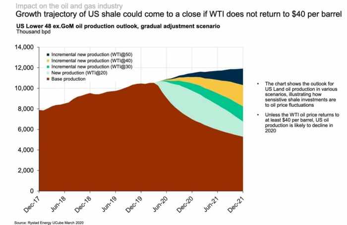 If the WTI worth continues at $20, Rystad’s predictions present that Decrease 48 manufacturing might drop to roughly 6 million barrels by the top of subsequent 12 months.