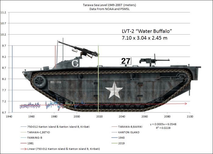 Determine Eight. Tarawa sea degree disaster (2007-2100). LVT-2 “Water Buffalo” added for scale. Vertical traces in 1943, 1981 and 2019 at 9.7 m signify the unchanging most elevation of Tarawa. The taller traces are antennae on the LVT-2.