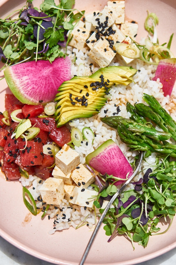 I sometimes use a watermelon poke, a model of this sushi rice (however any favourite sushi rice / mix will do), and a number of different vibrant toppings. Right here you see agency, natural tofu, sliced avocado, blanched asparagus, shaved watermelon radish, and micro sprouts. The bowl is drizzled, merely, with good soy sauce. And there is a sprinkling of sesame seeds and scallions. The opposite topping I actually crave, not pictured right here, is a showering of crispy, fried shallots.