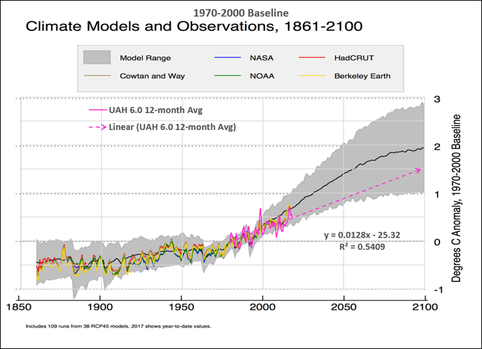 Determine 2. “RCP4.5 CMIP5 multimodel imply anomalies (in black), two-sigma mannequin vary (in gray), and observational temperature information from NASA, NOAA, HadCRUT, Cowtan and Means, and Berkeley Earth from 1861 to 2100. Mannequin knowledge makes use of blended land/ocean fields. NASA and NOAA knowledge begins in 1880. A preliminary worth for 2017 relies on temperature anomalies by the top of July. Chart by Carbon Transient.” (Modified after Carbon Transient.)