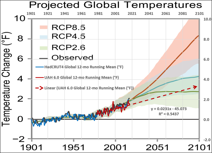 Determine 3b. UAH v6.zero is nearer to RCP2.6 than RCP4.5. (Having Enjoyable With the Fourth Nationwide Local weather Evaluation Report)