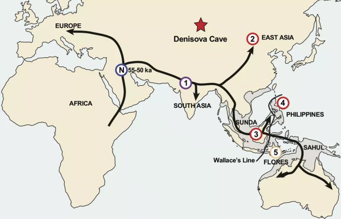 Trendy people additionally appeared to have interbred with Denisovans in a variety of places, akin to East Asia, the Sunda Shelf, and the Philippines (2, three, and four on the map).