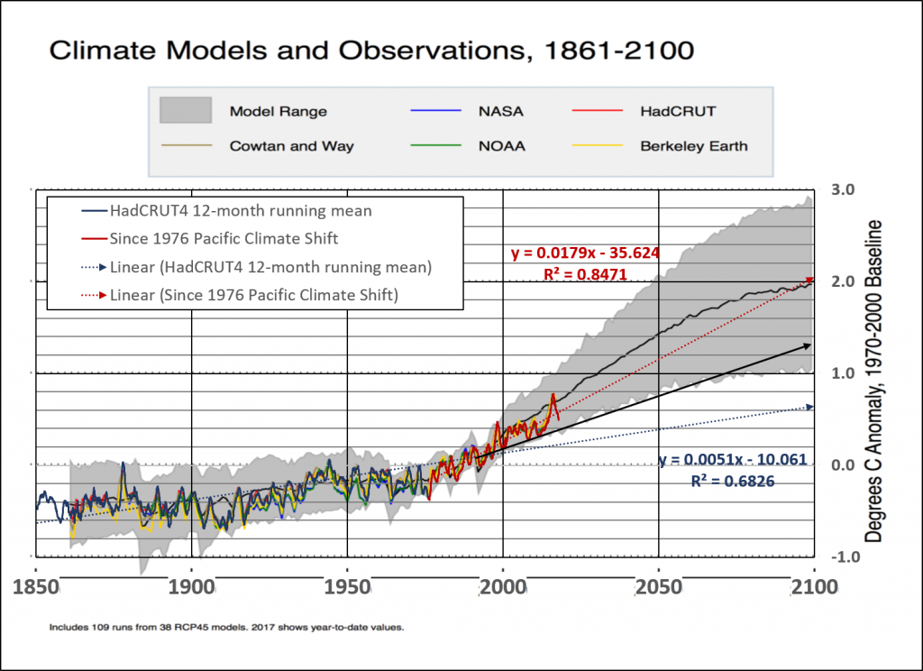 Output of 38 RCP4.5 fashions vs observations. The graph is initially from Carbon Transient. I up to date it with HadCRUT4, shifted to 1970-2000 baseline, to reveal the post-El Niño divergence. HadCRUT4 is monitoring under the RCP4.5 mannequin imply, close to the underside of the 5-95% band.