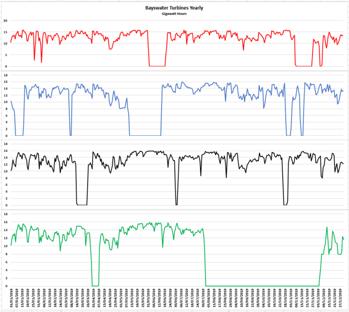 Within the case of wind all stations linked to the jap grid have been included. Within the case of coal evaluating all stations with wind would create a big mismatch. There are 16 coal-fired energy stations which dispatched 140 TW hours of power in 2019 in opposition to 17 TW hours for wind. I’ll select our second largest coal-fired energy station Bayswater within the Hunter Valley. In 2019 this one station dispatched 16 TW hours and was not working at full capability. It has 4 generators every of 660 MW so a joint plate capability of 2640 MW. In 2019 the capability issue for this station was 70%. What this implies whether it is to be utilized general to black coal energy stations is necessary. A black coal energy station is clearly beneath the management of its operators and this may be seen graphically.