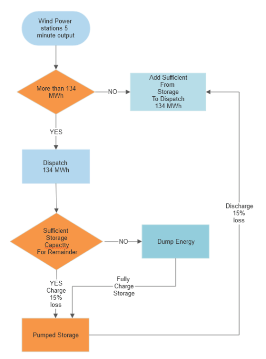 So right here graphically is the method. The inexperienced exhibits when there may be extra power that can be utilized to cost storage and the purple exhibits when power should be drawn again from the storage. The black line represents a relentless dispatch to the grid. After all, if this infrastructure have been constructed wind would then be beneath management and the dispatch would range in line with the demand.