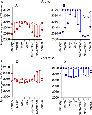 Fig. 2 Approximate 12 months by which the two°C warming threshold is reached for the Arctic and Antarctic in comparison with the globe as a complete.