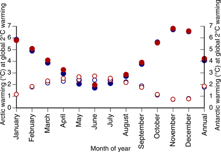 Anticipated magnitude of month-to-month and imply annual warming above the 1981–2005 imply within the Arctic (strong circles) and Antarctic (open circles) with 2°C world warming beneath RCP8.5 (purple) and RCP4.5 (blue) in keeping with 36 CMIP5 ensemble runs by Overland et al. (1).