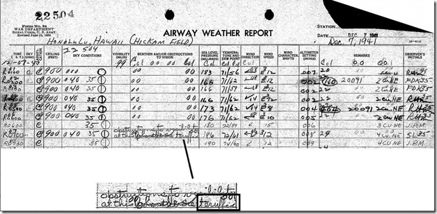 Precise hourly climate observations proven right here as recorded by the climate observer at Hickam Discipline in Honolulu, Hawaii on the morning of December 7, 1941. The highlighted textual content seems to say “obstructions to visibility at this (scribbled)” after which what seems to be the phrase “terrified”. The obstruction to visibility right now might have been “smoke”. The climate observer on at the present time was PFC Sherman Levine of the US Air Corps and he died in the course of the assault, probably a couple of minutes after finishing the final commentary on this small slip of paper. For extra on the lifetime of PFC Sherman Levine, click on right here.